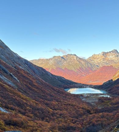Começamos a caminhada no Vale de Tierra Mayor, e atravessando florestas nativas e turfeiras, chegamos à famosa Lagoa Esmeralda. Esta é nossa primeira parada após uma hora de caminhada, onde faremos uma pausa de alguns minutos para contemplar esse belo cenário.