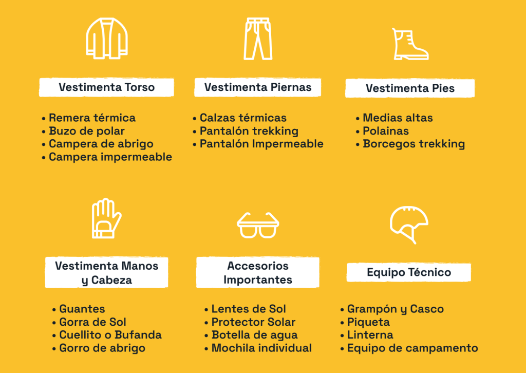 Las actividades no se cancelan por lluvia por lo que es importante estar bien vestidos a la hora de empezar un trekking. Se recomienda el sistema de vestimenta por capa, lo cual permite ir poniéndose y sacando fácilmente una u otra capa de acuerdo a la necesidad.